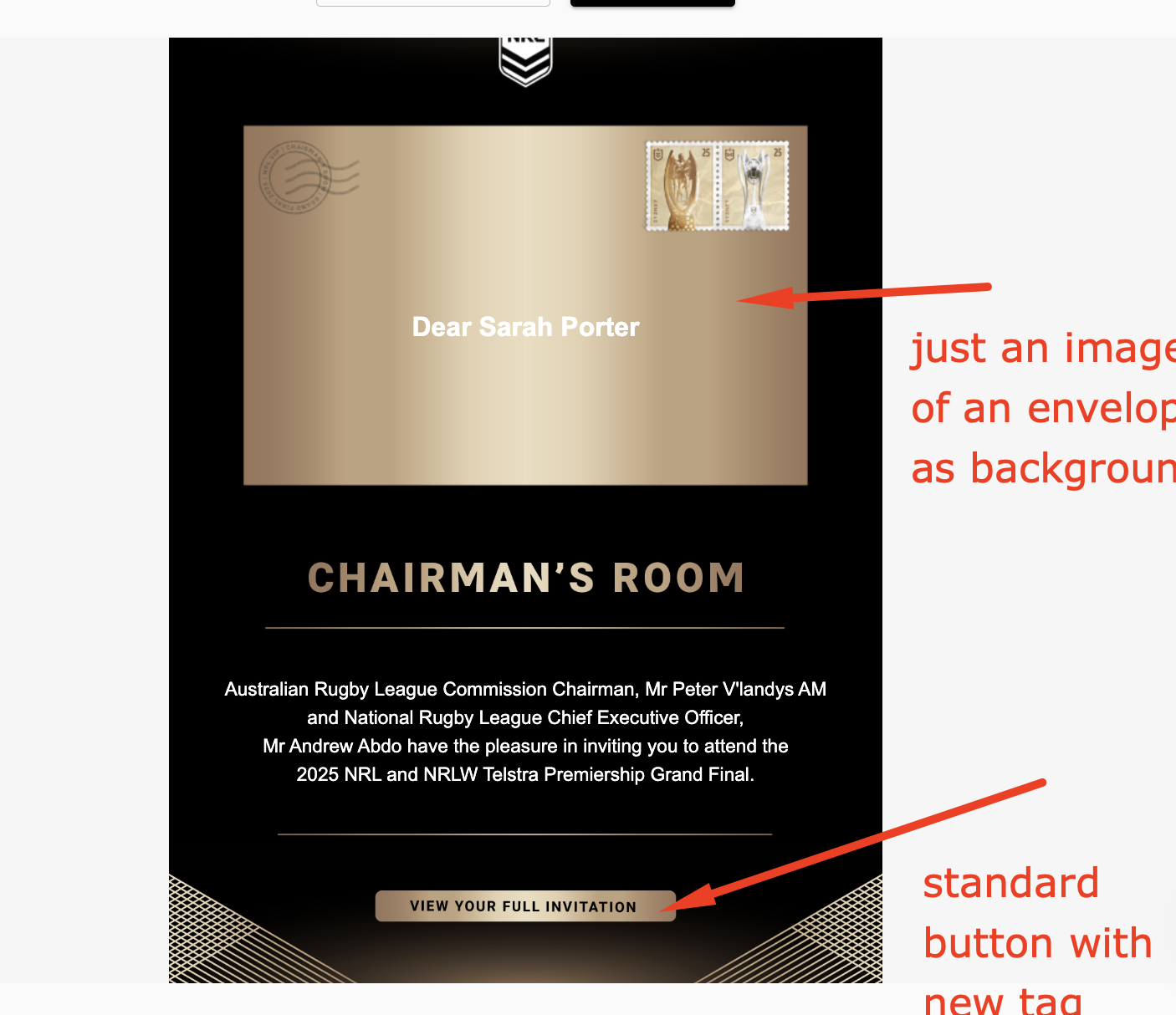 The EDM that is firstly sent too user is the EDM of an envelope (or any content that transfers the recipient (guest) from the EDM to the webpage). The button “ click for invitation” takes user to the animated web page. A new tag has been created for this is {{invitation_letter_link}}.