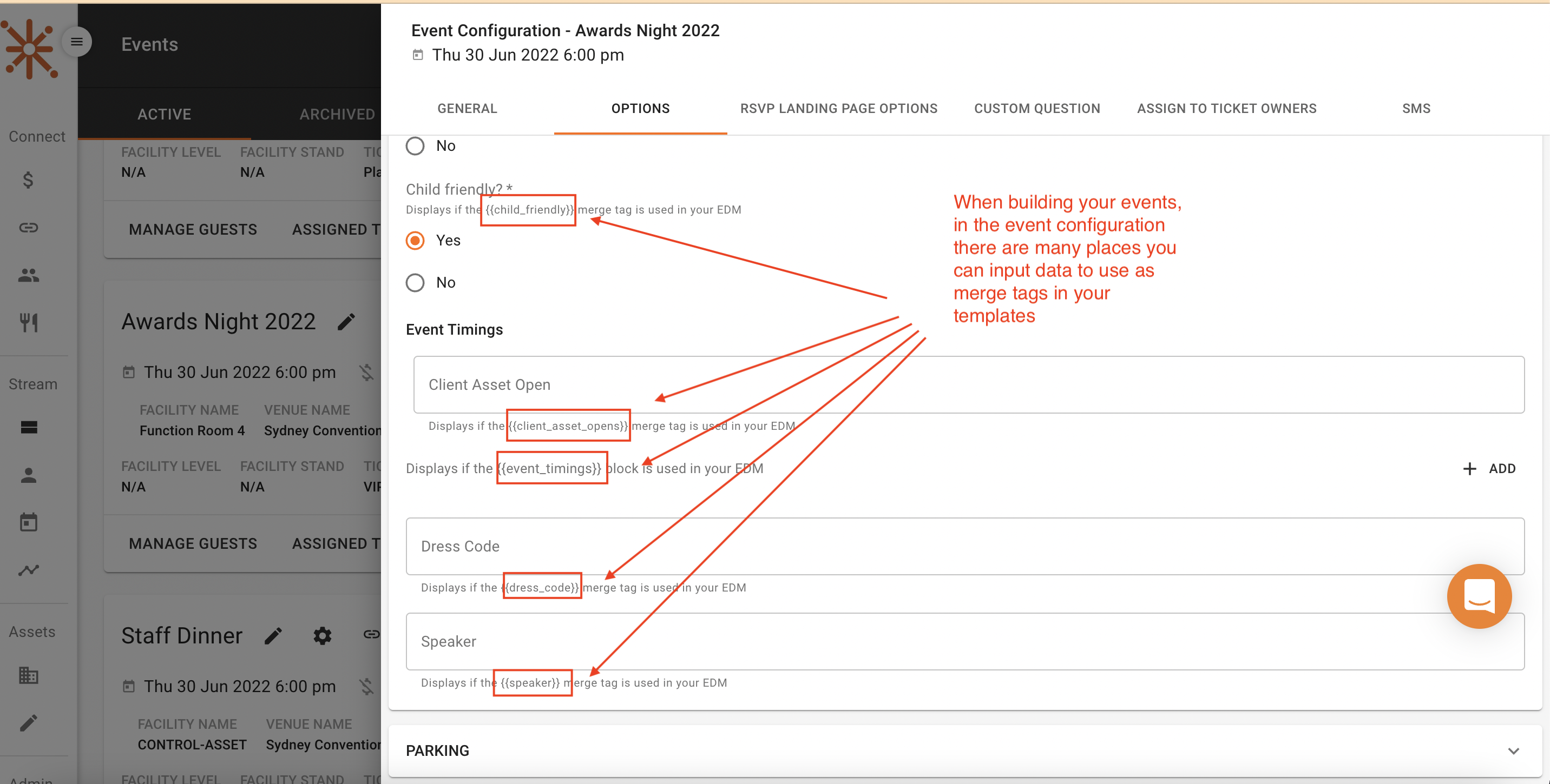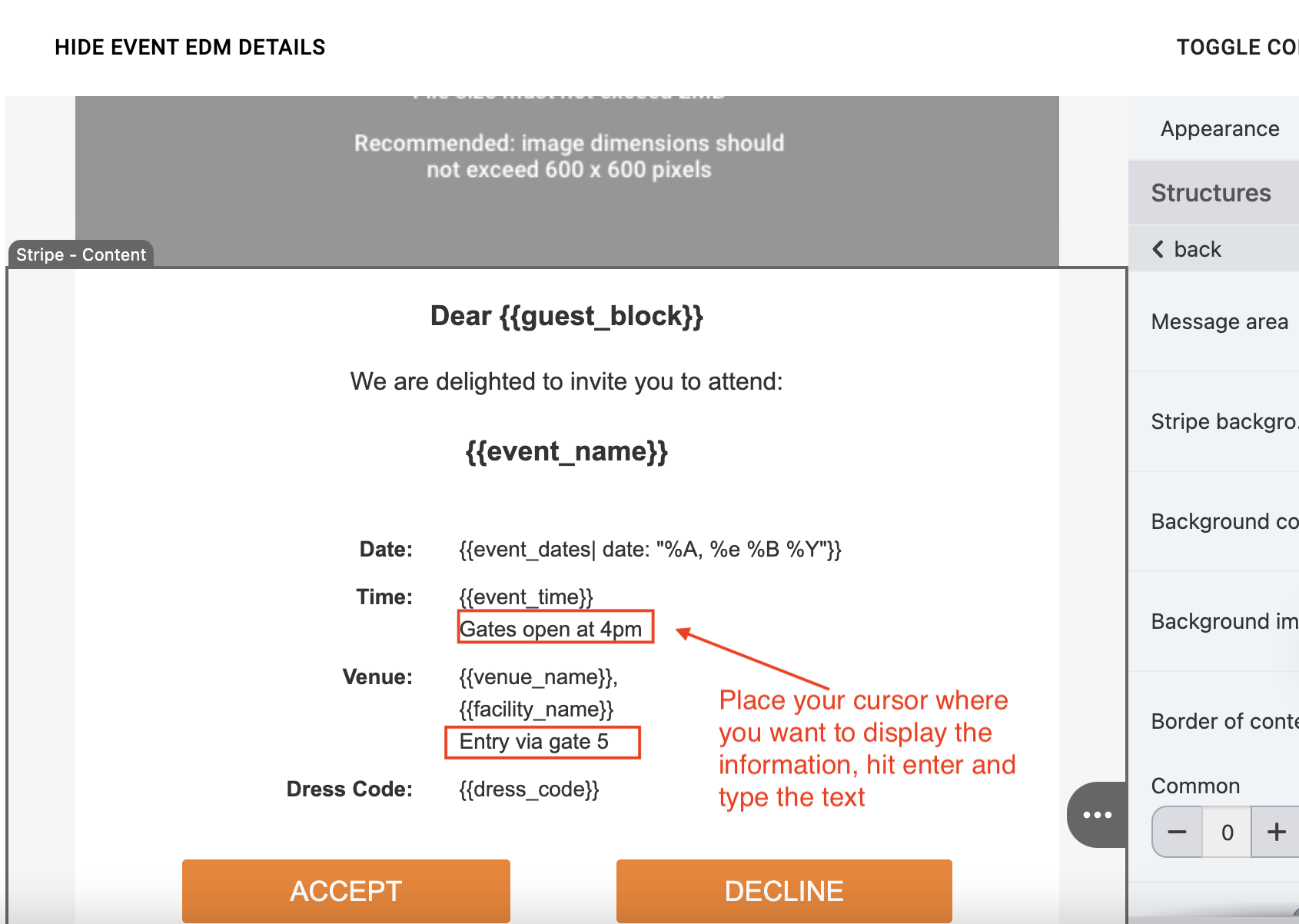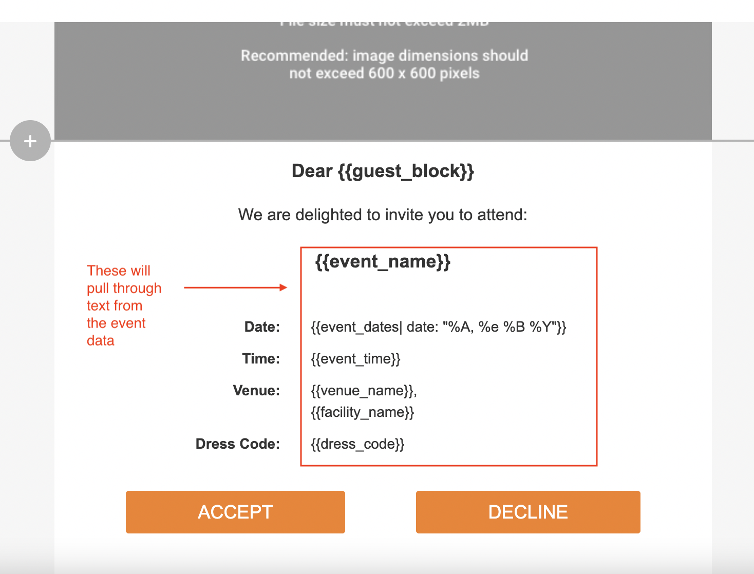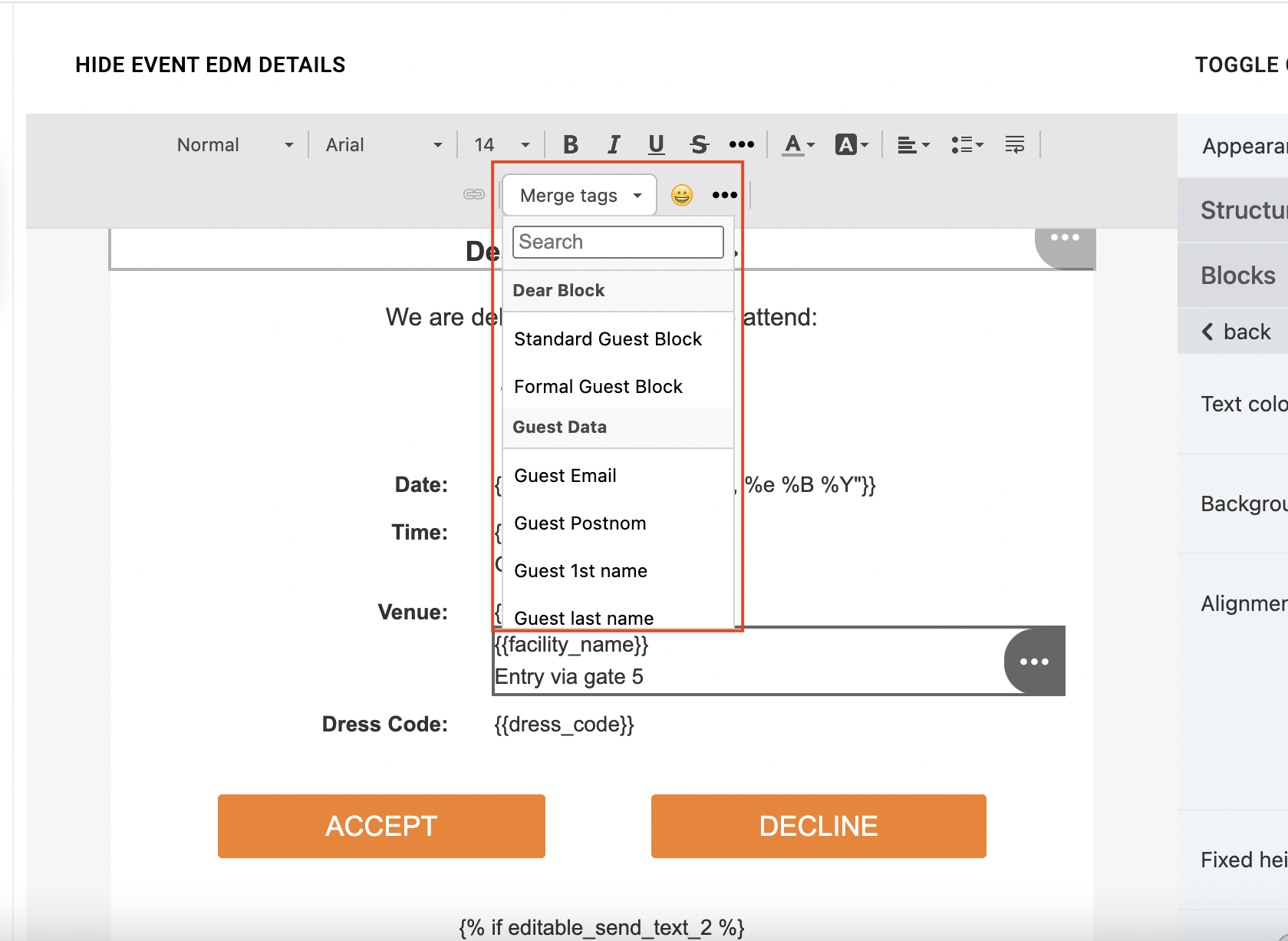 When building and editing EDMs you will see merge tags in curly braces like #{{event_name}}, #{{guest_block}} etc.