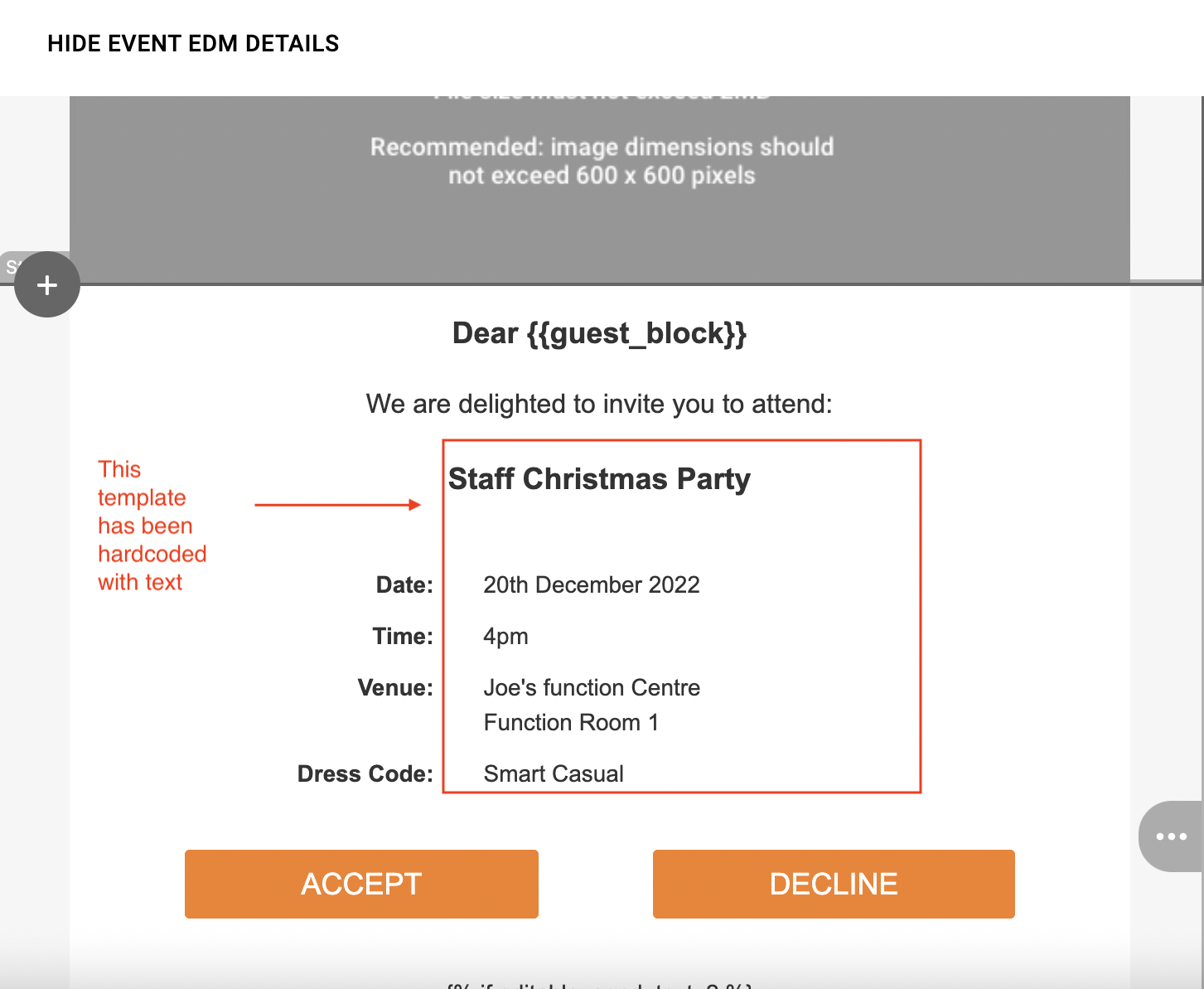 If your template is for a one off event: you can “hard code” everything about the event as text. Any text you want to include about the event can be typed directly into your template. Please note, the guest merge tags (i.e. guest_block), and any logic statements would still be included.