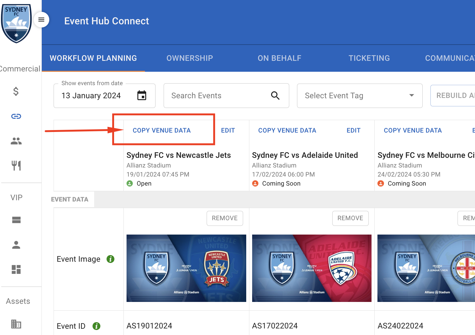 Once an Event ID is matched by a hirer a new button on the workflow is enabled - for the hirer. "Copy Venue data"