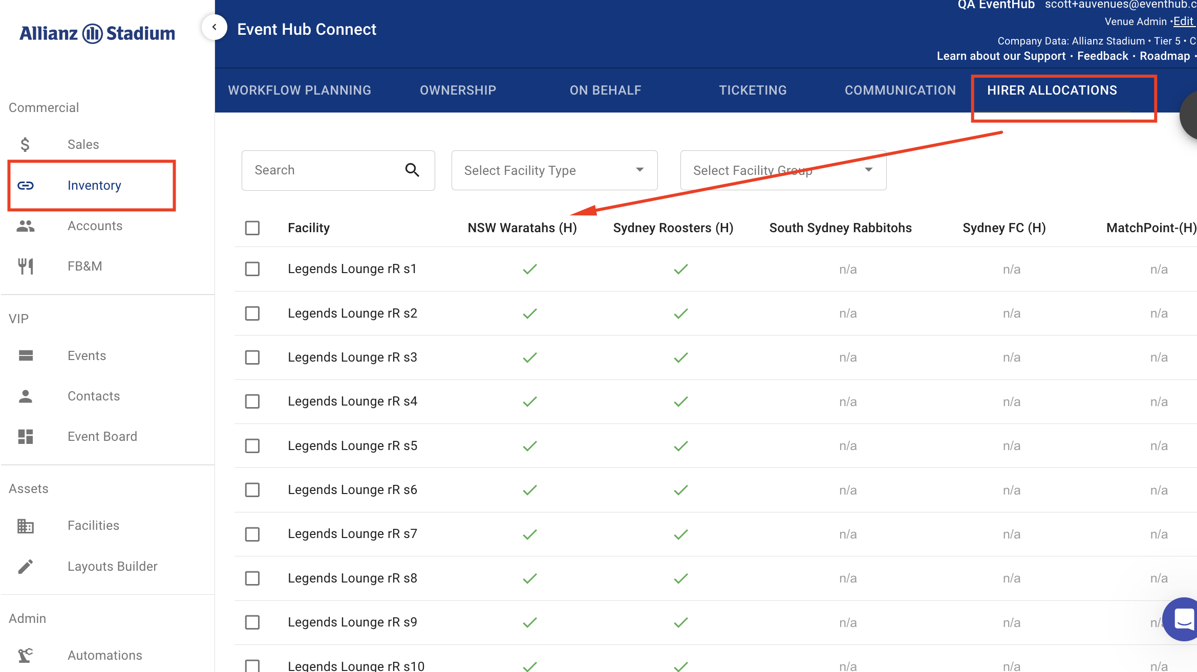 A team allocation is set as per below. This is applicable for initial setup only. In the Hirer allocations Tab. This tab is only found in venue systems (not the Hirer). Any assets a team might use on any event need to be set here. This is so the same assets are joined (or linked) between the Venue and the team or Hirer and tickets can be shared to the same asset.